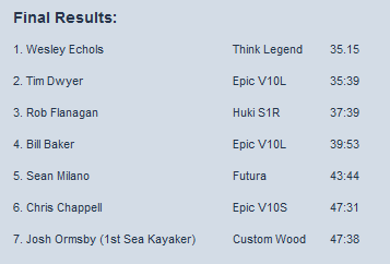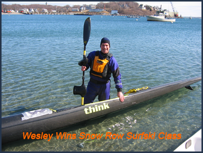 Wesley built on his lead to about 10 boat lengths and carried on stroke after stroke into the strong wind and tide. With a first place finish in his grasp he kept up the pace and finished hard first out of six skis. Being first across the line is a rare event for most of us mid-pack paddlers and Wesley, always so modest, should enjoy the experience. The winter on water training time this winter paid off. All that time working on the new website, with Chris Chappell as webmaster, has not diminished his paddling efforts. This also was his first race in his new carbon Think Legend.